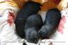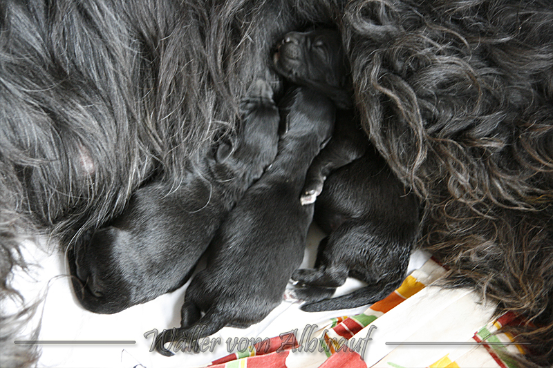 Die Geburt unserer C-Wurf Welpen war etwas speziell. Unser erster Welpe, eine Hündin, kam am 16.05. um 19.40 Uhr mit einem Geburtsgewicht von 386 gr auf die Welt. Zwei Stunden später, um 21.42 Uhr kam dann die zweite Hündin mit einem Geburtsgewicht von 398 gr auf die Welt. Nun warteten wir auf die Geburt weiterer Welpen, doch es kamen keine mehr. Cibi ging es gut, so dachten wir es bliebe bei diesen 2 Welpen. Einen Tag darauf bekam die Cibi dann aber nochmal Presswehen. Wir waren sehr erstaunt darüber. so ging das zweieinhalb Stunden. Zwischendurch immer mal wieder raus in den Garten und die Beine vertreten. Nichts passierte. Langsam machten wir uns Sorgen und riefen dann bei unserem Tierarzt an. Die Cibi brachte dann auf der Fahrt zum Tierarzt unseren kleinen Rüden zur Welt. Da lag er, fein säuberlich gereinigt, abgenabelt und zufrieden säugend.