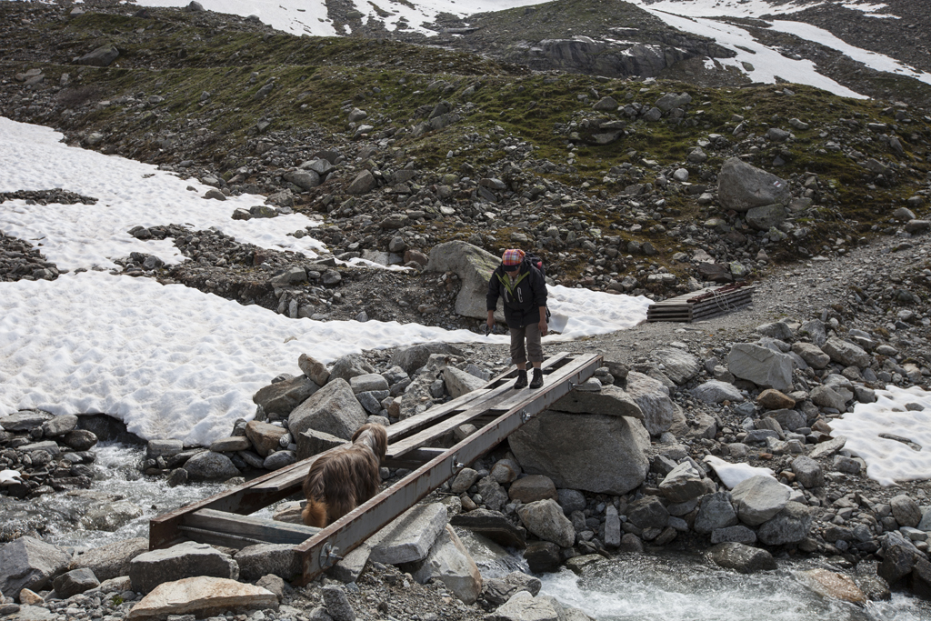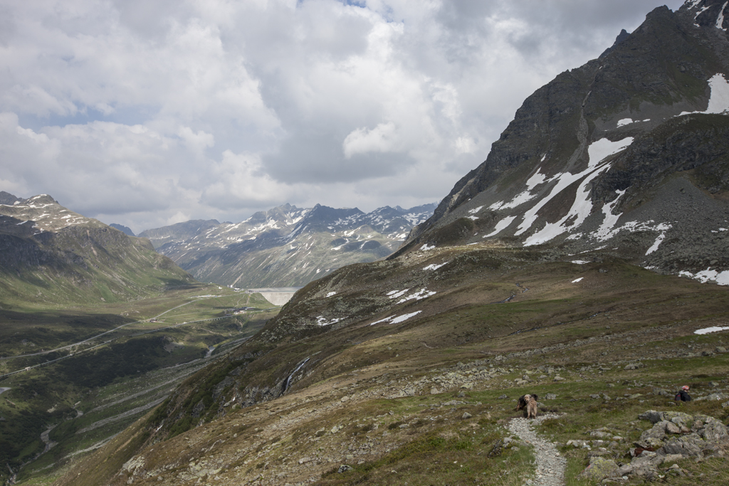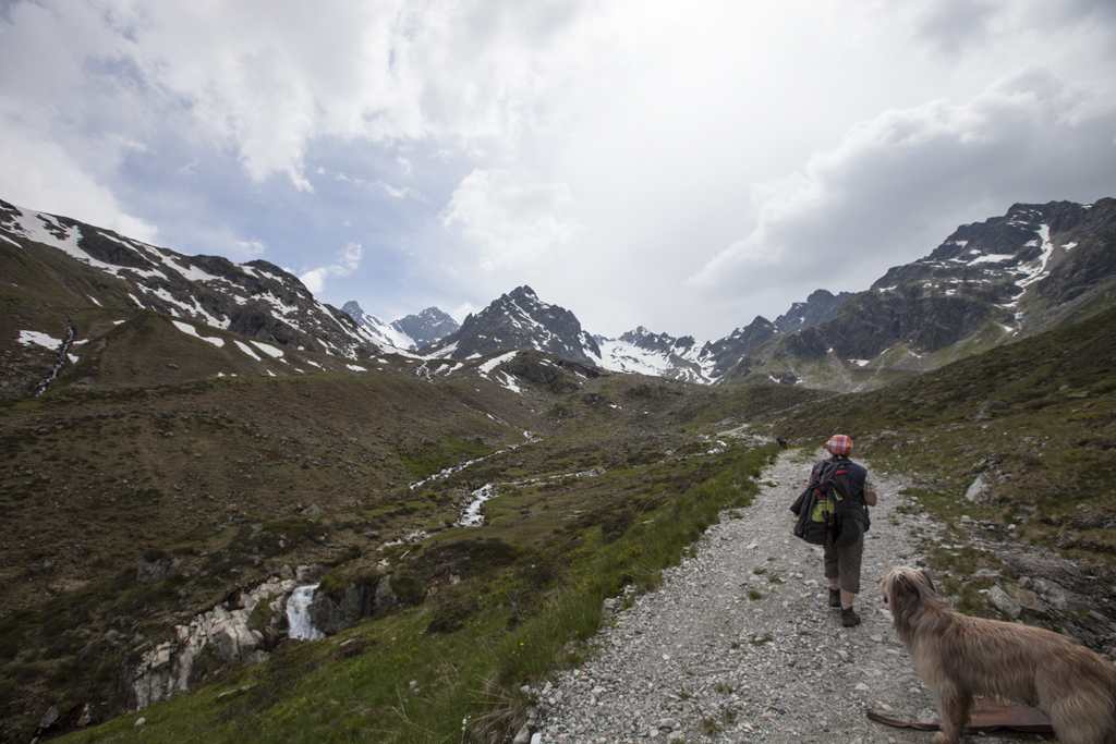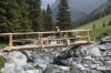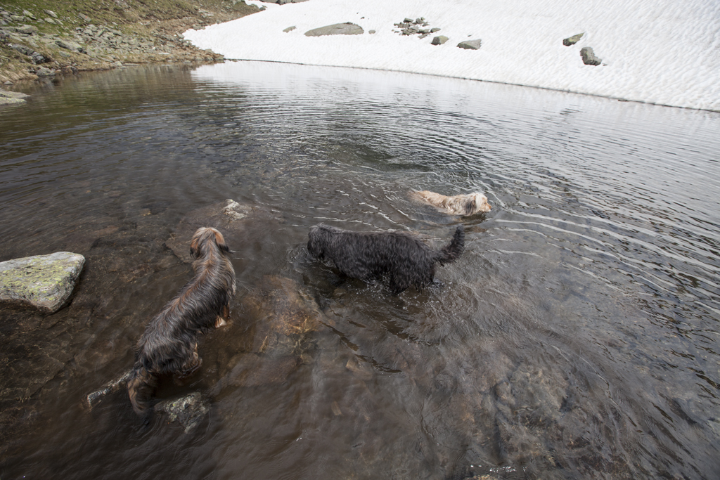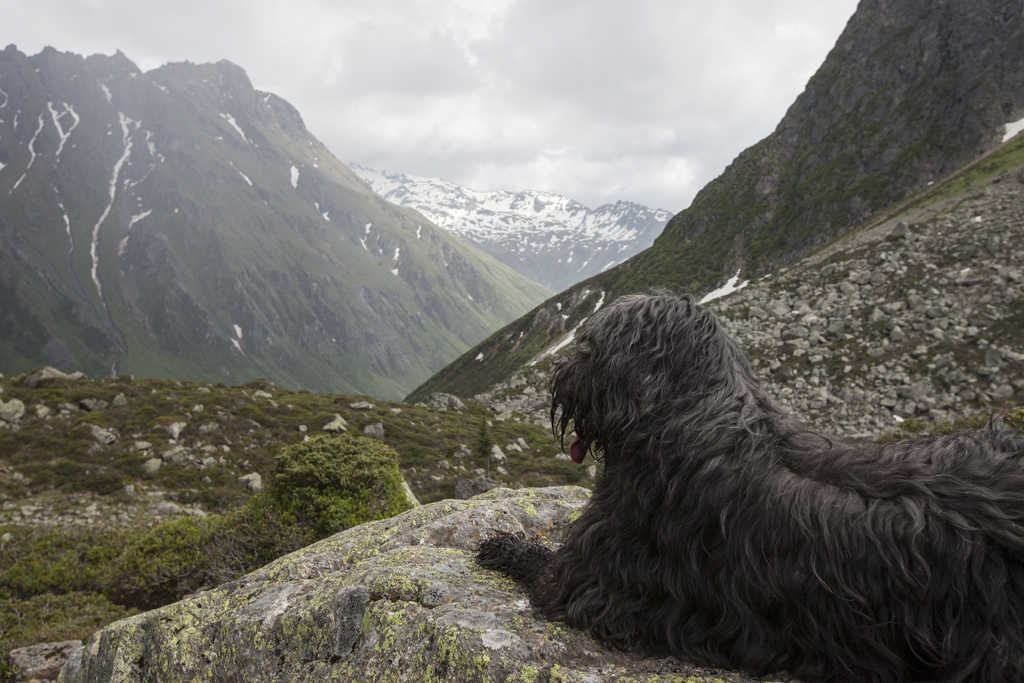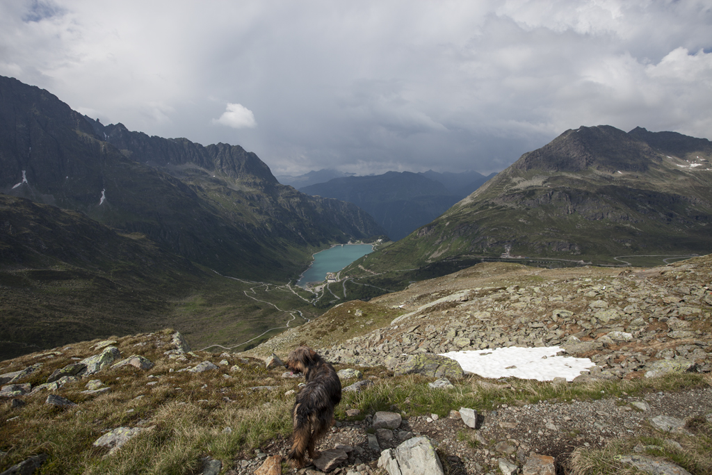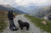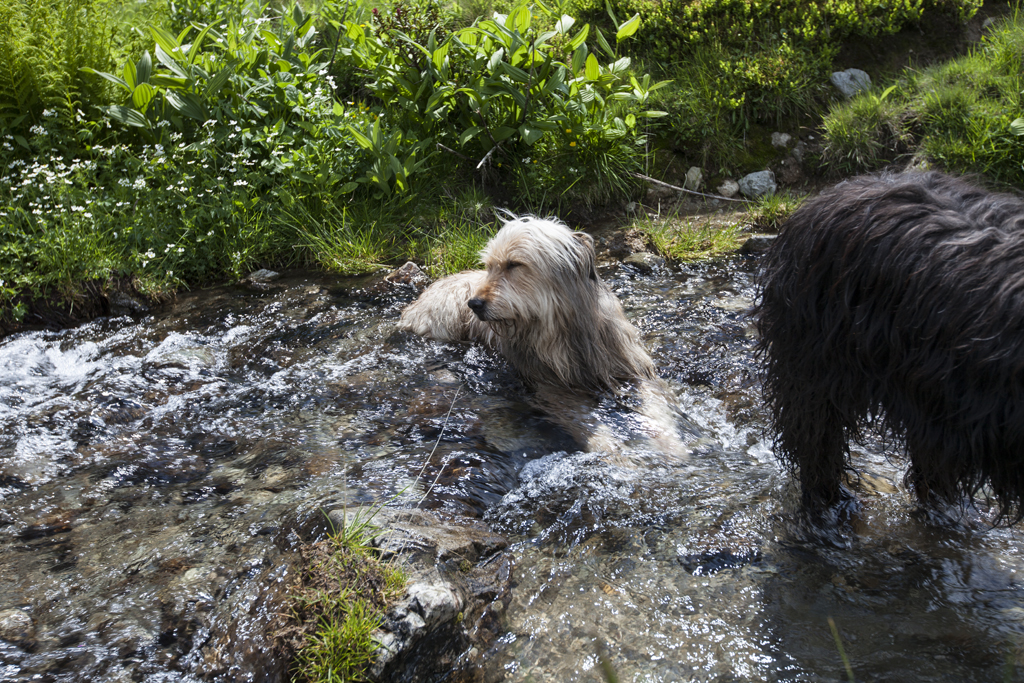 Da wir direkt an der Silvrettahochalpenstrasse waren, musste ein Ausflug auf die "Bieler Höhe" natürlich sein. Von dort starteten wir unsere schon alpine Rundtour auf ca. 2400 m, und kamen unterhalb der "Saarbrücker Hütte" vorbei. Einige Schneefelder waren zu überqueren und auch eine provisorische Brücke stellten Herausforderungen für Mensch und Hund.