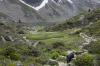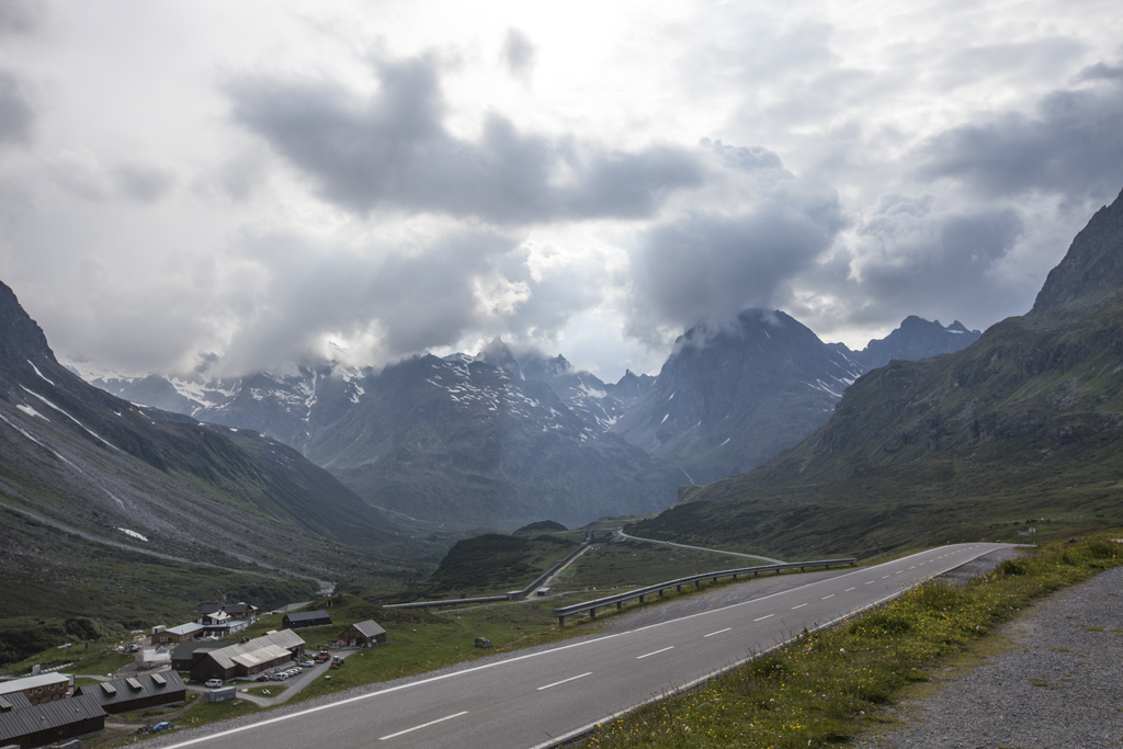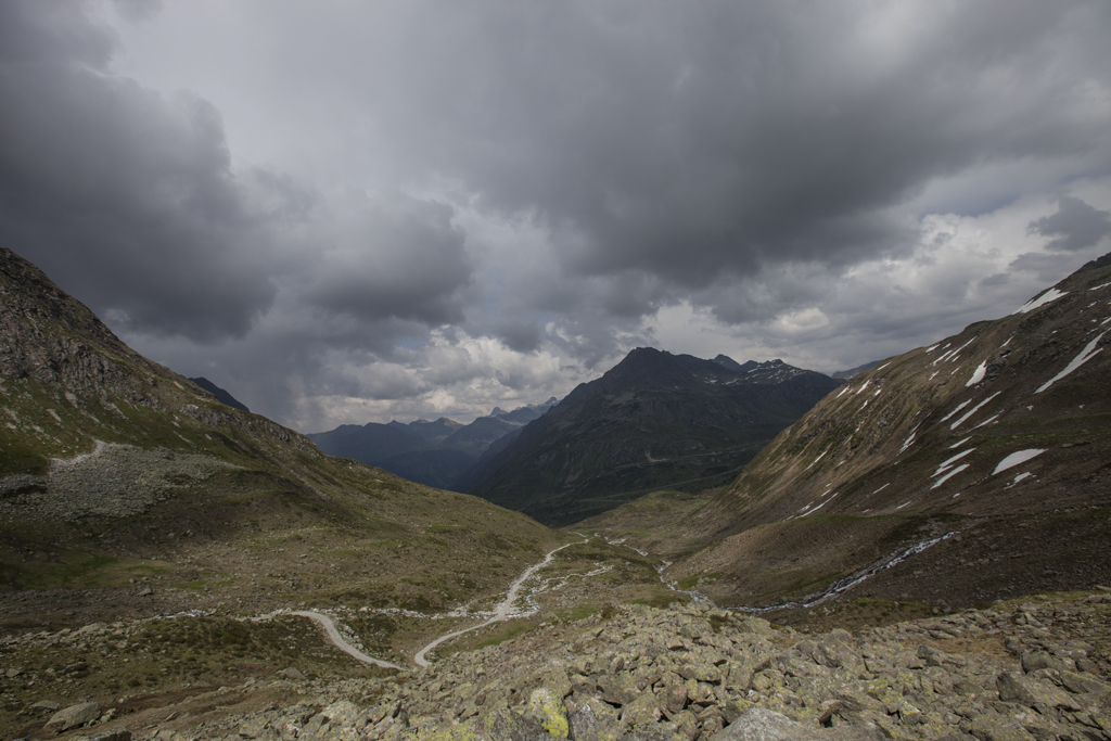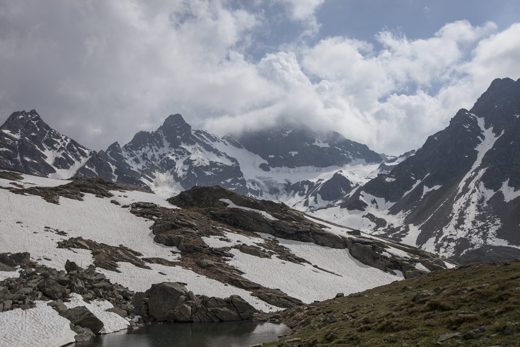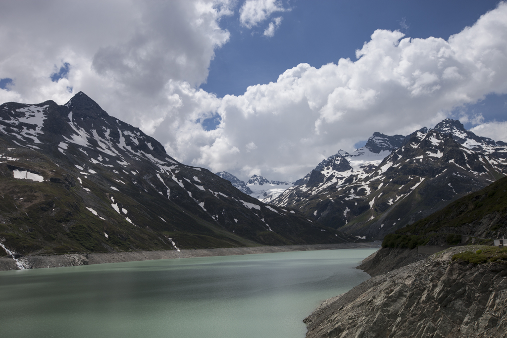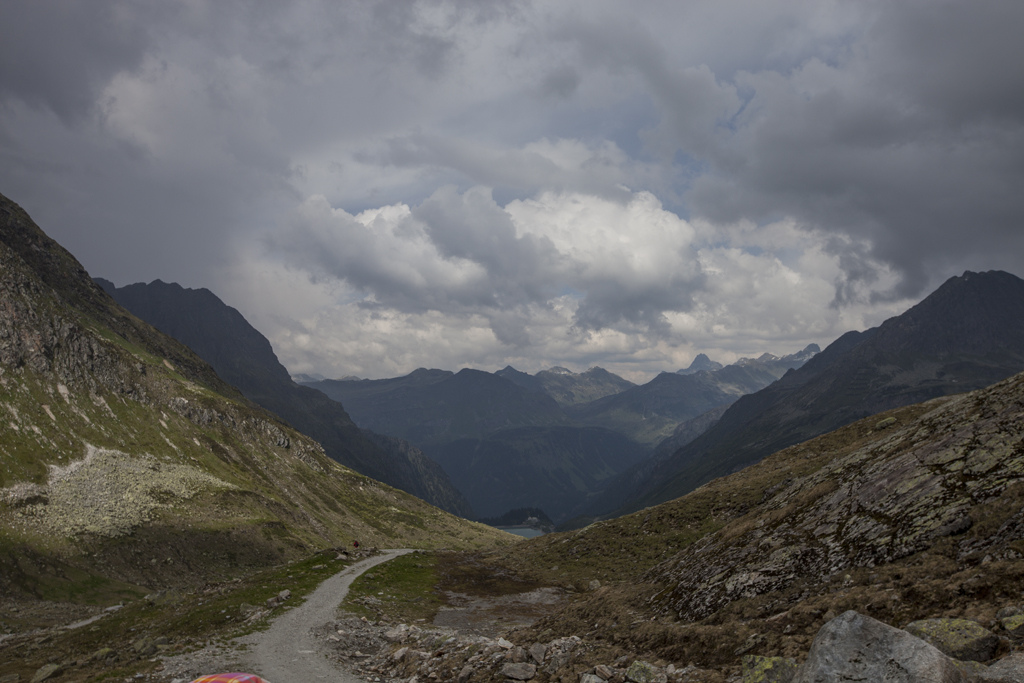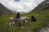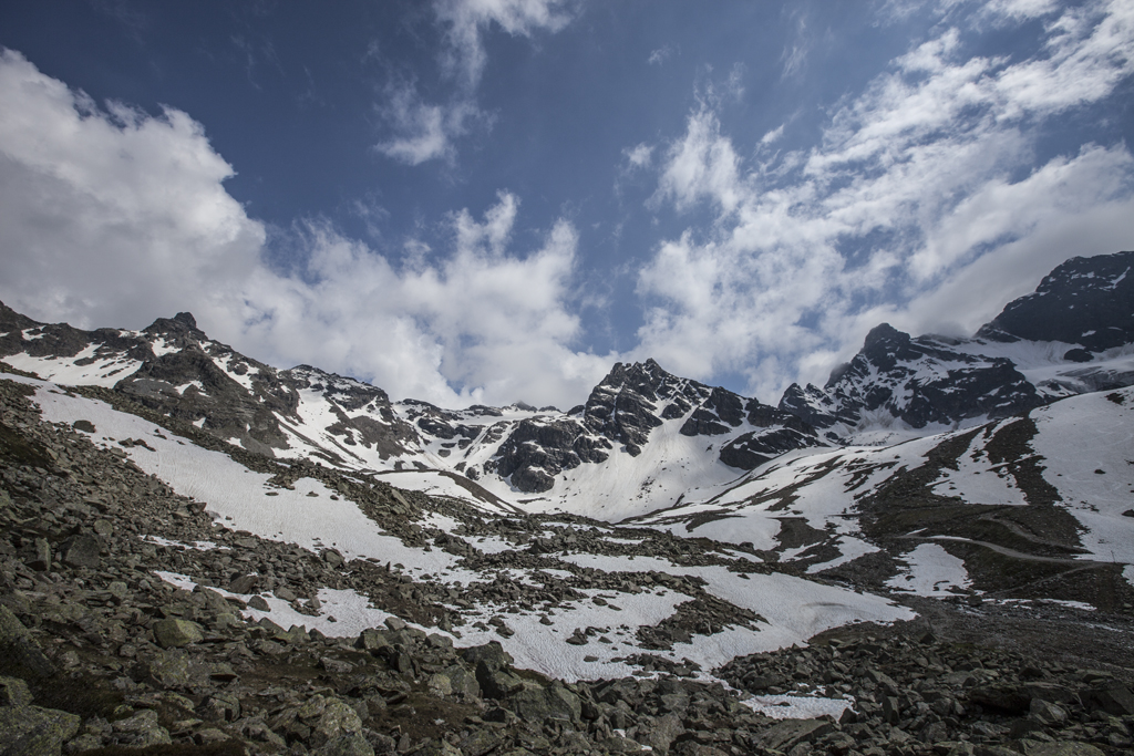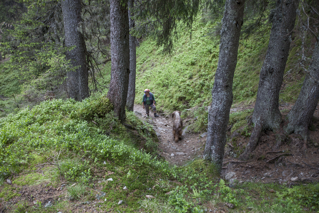 Da wir direkt an der Silvrettahochalpenstrasse waren, musste ein Ausflug auf die "Bieler Höhe" natürlich sein. Von dort starteten wir unsere schon alpine Rundtour auf ca. 2400 m, und kamen unterhalb der "Saarbrücker Hütte" vorbei. Einige Schneefelder waren zu überqueren und auch eine provisorische Brücke stellten Herausforderungen für Mensch und Hund.